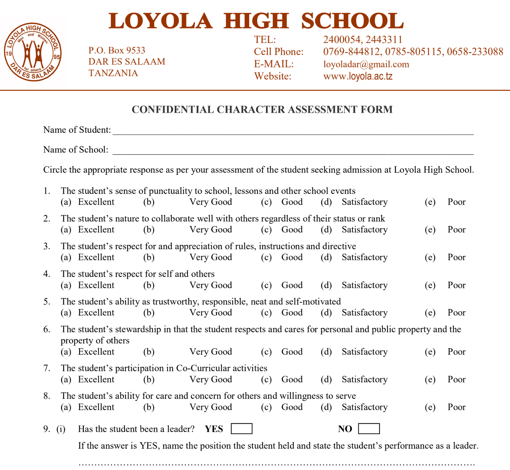 As part of the entrance examination application process for Form II and Form III (2026 intake) at Loyola High School, a Confidential Character Assessment Form is required. This form must be completed by the Headmaster/Headmistress of the student’s current school to evaluate key attributes such as punctuality, collaboration, respect, trustworthiness, and leadership.